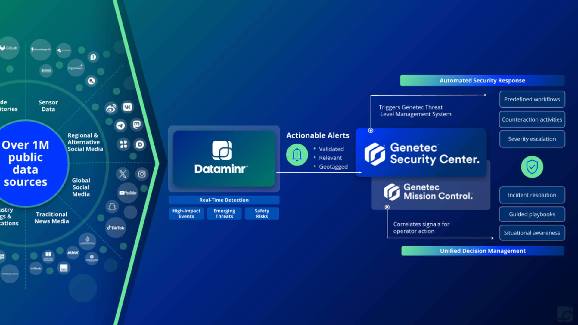 Dataminr feeds AI-powered signals about risk and safety events gathered from text, video, audio, and images directly into Genetec Security Center. Geo-tagged alerts from Dataminr can trigger predefined responses, such as locking doors, directing cameras to incident locations, or activating emergency protocols, while providing operators with contextual information and guided workflows, all within a single pane of glass.