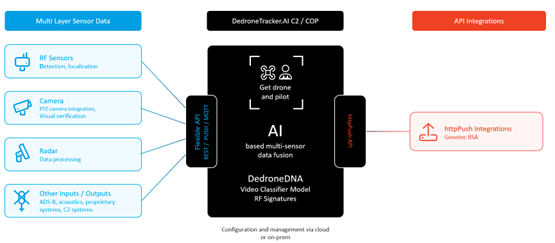 DedroneTracker AI collects and fuses data from different sensor layers such as RF-sensors, cameras and radars and does multi-sensor data fusion. This data will be sent to RSA via httpPush API for further processing in the RSA UI.