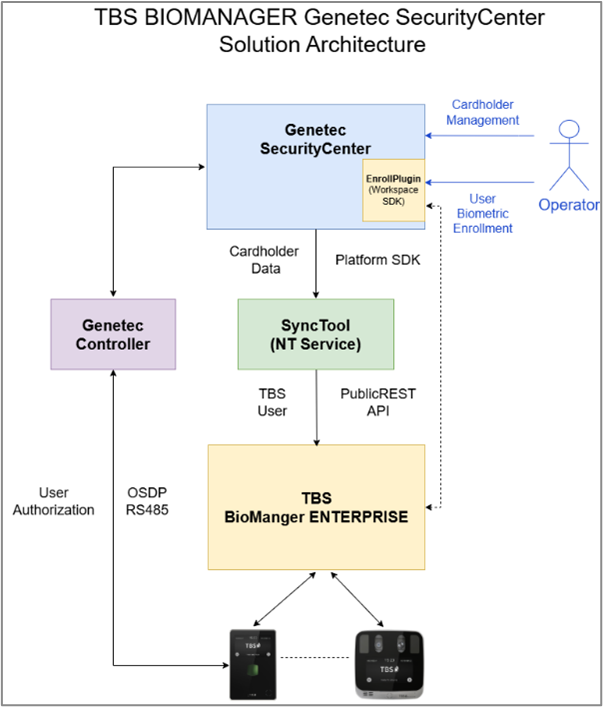 Integration enables automatic synchronization of the master cardholder database from Security Center to BIOMANAGER. Any user changes made in Security Center are seamlessly reflected in TBS via the SyncTool. Biometric enrollment can be carried out directly from the Cardholder window in the Security Center interface, thanks to the EnrollPlugin integration. Cardholders are authenticated through TBS devices, while access rights are verified by Genetec controllers via OSDP interface which in turn creates access events within Security Center.