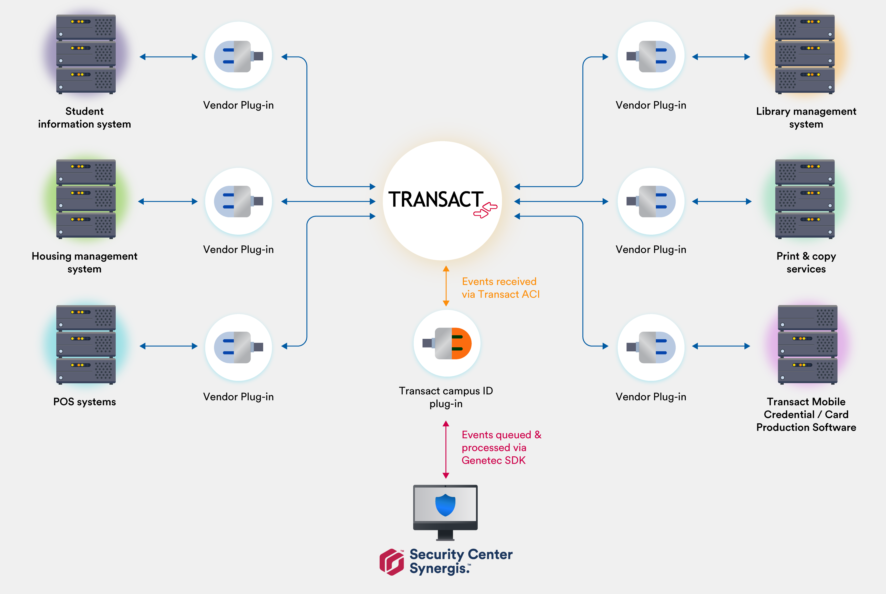 Transact’s Access Control Integration (ACI) connects with Genetec Synergis to automate provisioning and deprovisioning of user credentials and access rights. It synchronizes updates in real time, aligning with other systems such as housing, dining, and ID card management. - What It Does